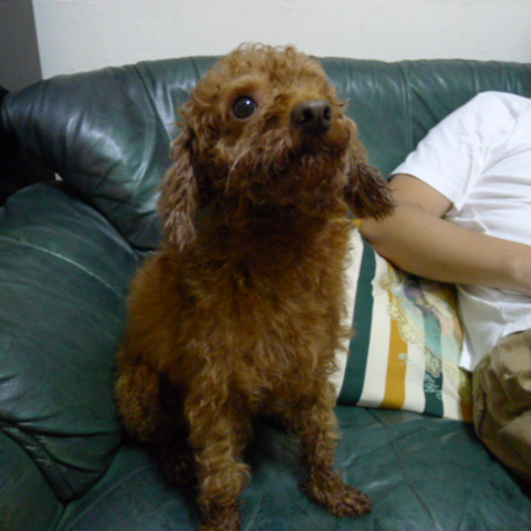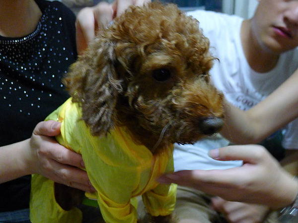 (剛洗完澡,我們硬是要幫他試穿新買的雨衣,所以牠超無奈的......因為娘砲阿噗只要下雨天,就不願意出去"解決".....)
