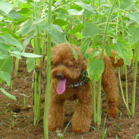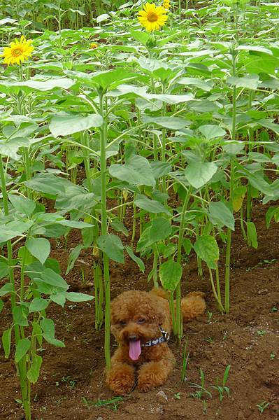 ↓那天的經典!我家噗仔熱到躲在向日葵下死不走,看起來就是熱到快昏倒的臉,果真是搞笑的人養爆笑的狗啊.....