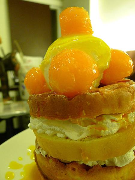 ↑好過頭鬆餅塔,頂樓住冰淇淋跟冰凍哈密瓜,樓下第一層住香蕉、再來是奇異果、最下層是芒果,都尬鮮奶油。