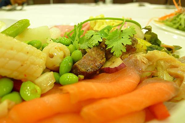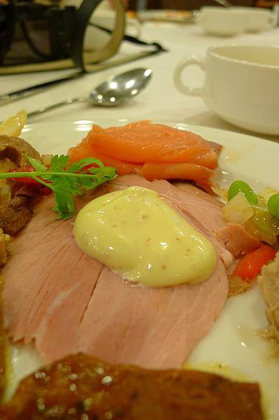 ↑只有燻鮭魚跟甜點還OK的晚餐.....(沒排到二樓,在另一間B1的餐廳,我們覺得根本是吃到團客級的餐點......)