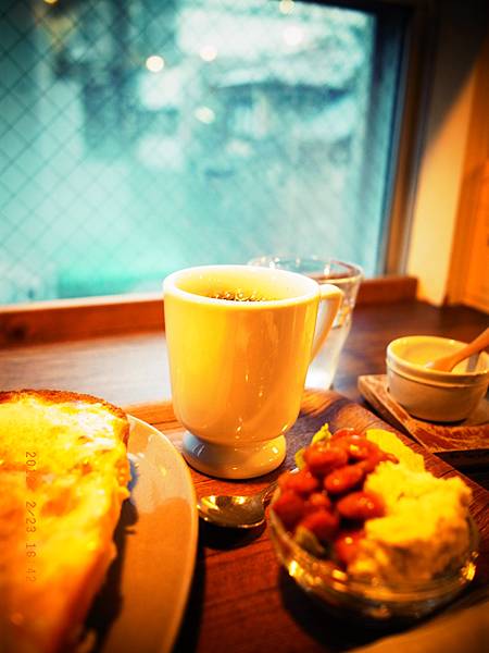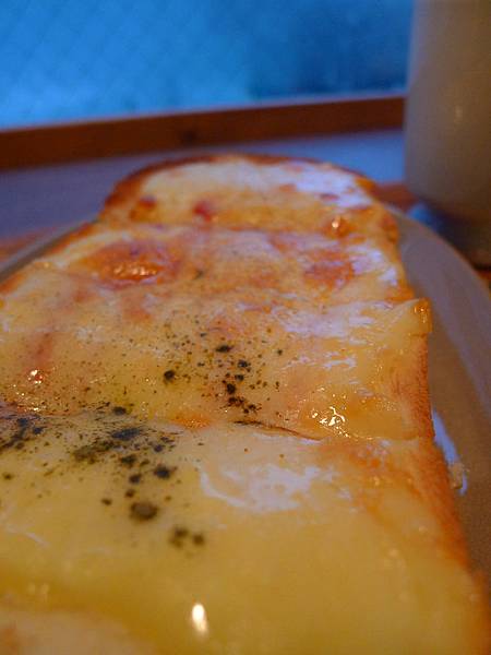鬆軟的起司吐司上灑著微量的咖啡粉
